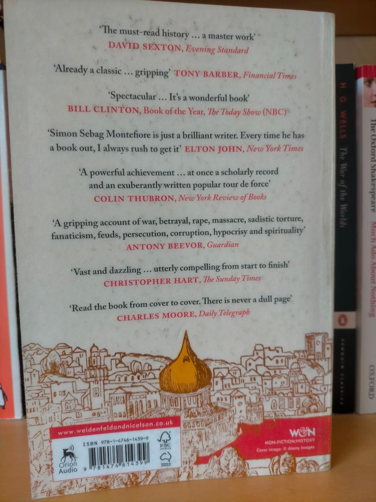 Condensing 3,000 years of history into 650 pages would be overwhelming for any author, but Montefiore has done an excellent job in condensing the main events, characters and stories of each time period. The book is primarily a chronological narrative history, examining the stories and lives of men, women, and families throughout. It is divided into nine main parts (see below) covering the main dynasties, religions and rulers of the time, with each chapter containing smaller sections covering people and events. Whilst each period is given their share of chapters in the book, there is a substantial emphasis on the 19th and 20th centuries – presumtively as more sources and details are available and events become more complex after the onset of the Industrial Revolution. The original 2011 hardback edition ended with the Six Day War and its aftermath, but the updated 2020 paperback edition takes the story into the present day, highlighting the continued political strife of the Arab-Israeli Conflict and the cultural, religious and political significance of Jerusalem today.